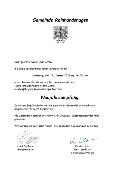 26 aktive und erfolgreiche Mitglieder des Vereins wurden eingeladen zum Neujahrsempfang der Gemeinde Reinhardshagen am 17. Januar 2026 um 16:00 Uhr in die Wesertalhalle