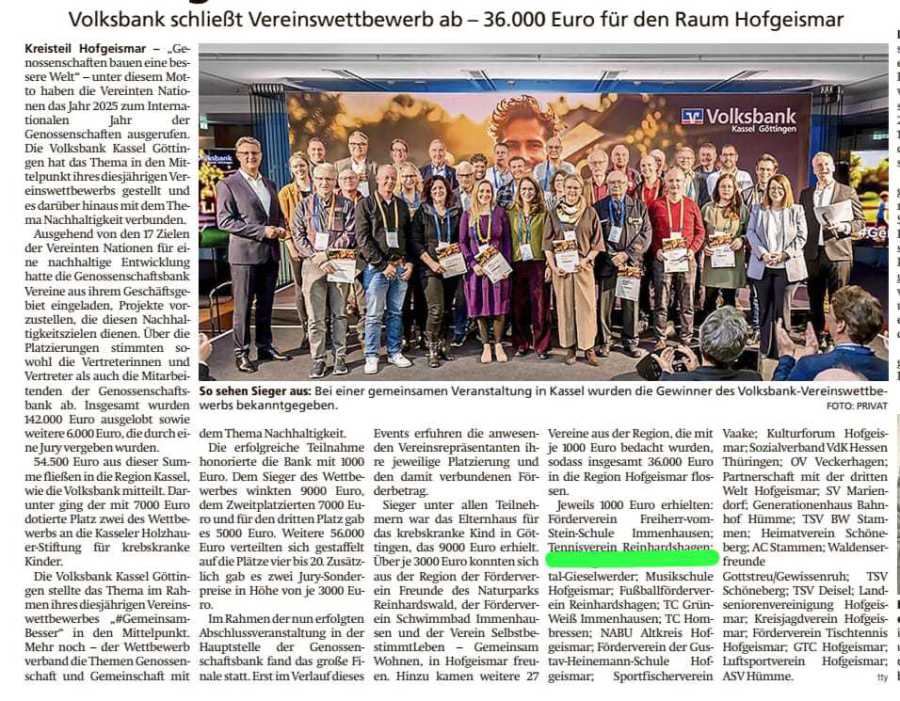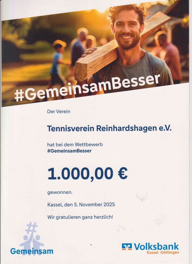 Seit vielen Jahren ist die Volksbank Kassel Göttingen Sponsor des Tennisvereins. Zum Jubiläum hat sie einen Wettbewerb #gemeinsam 160 ausgeschrieben, an dem wir uns mit einem sehr guten Beitrag beteiligt hatten.