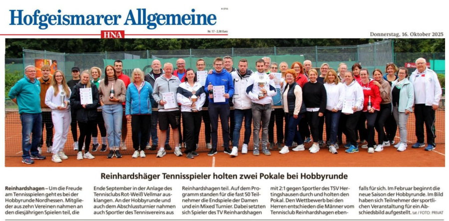 Am 27.09.2025 waren alle Spieler der Hobbyrunde Nordhessen zum Abschlussturnier auf die Tennisanlage des TSV RW Vellmar eingeladen. Auf dem Programm für die 48 Teilnehmer standen die Endspiele der Damen und im Mixed Doppel, ein Mixed-Turnier sowie die Siegerehrungen.