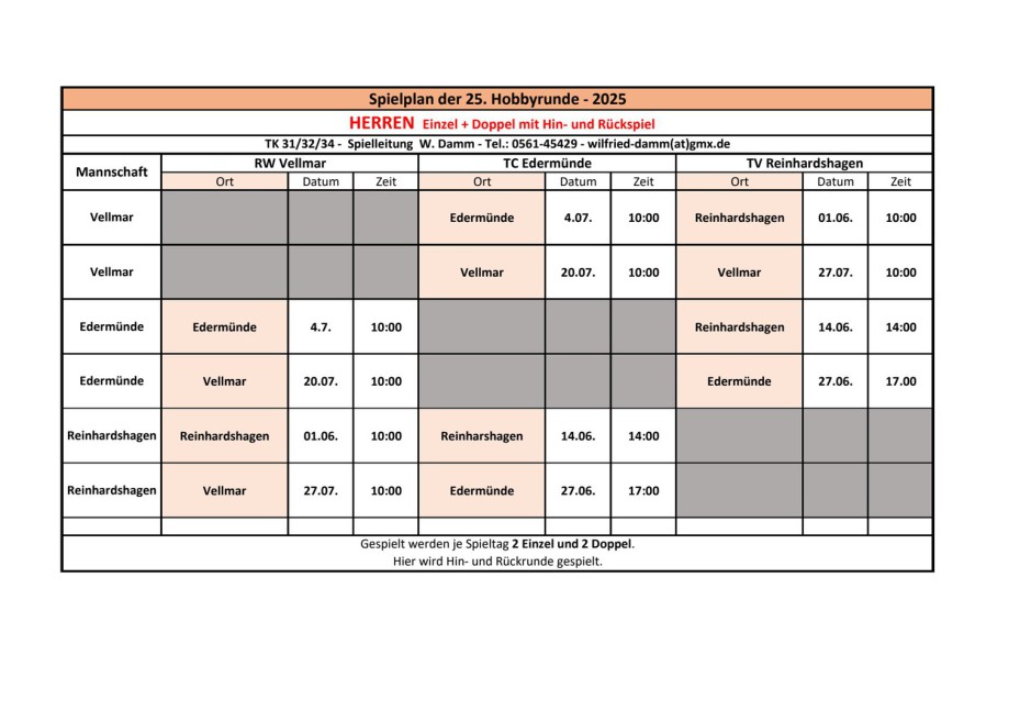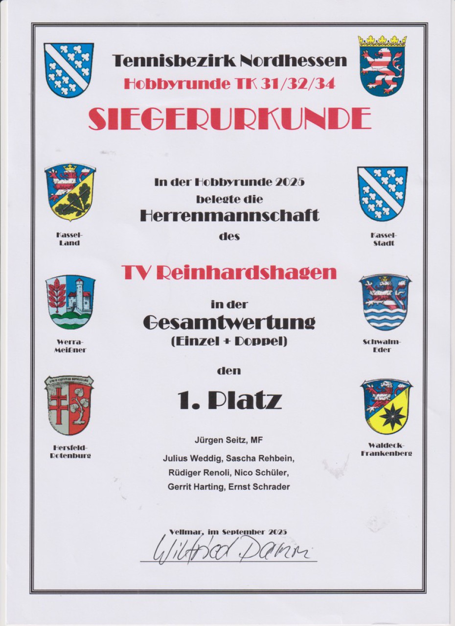 Am 27. Juli 25 fuhren wir zum Abschluss der Saison nach Vellmar zum Rückspiel. Nach dem Einzel von Gerrit Hartig (3:6/2:6) musste wegen Starkregen das Spiel abgebrochen werden und wurde am 01.08.25 mit dem Einzel von Ernst Schrader und den zwei Doppeln fortgesetzt.