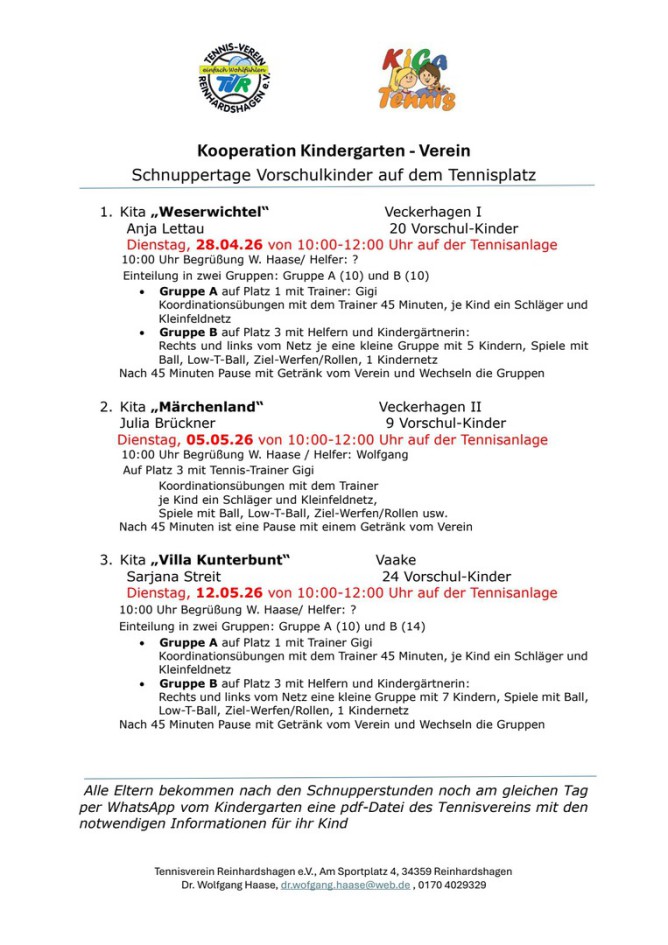 der Tennisverein Reinhardshagen wurde im Februar in Meetings mit den Leiterinnen der Kindergärten eine Kooperation vereinbart, um unseren Vorschulkindern die Möglichkeit für Bewegung auf dem Tennisplatz zu geben.
