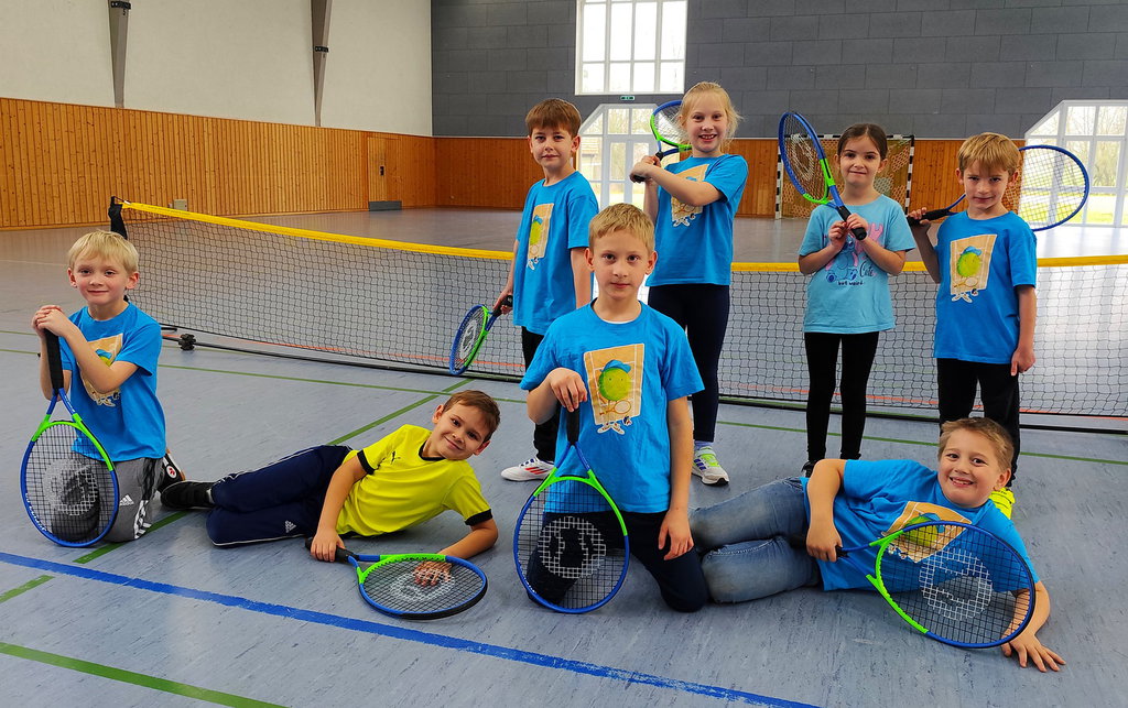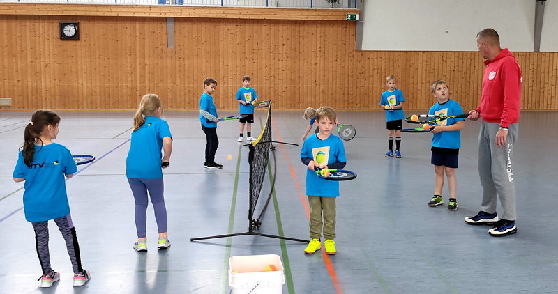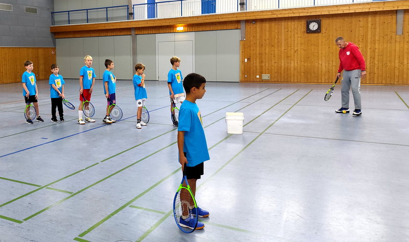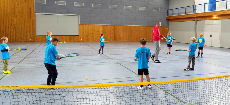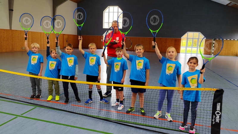 Zu Beginn erhielten alle Kinder vom Vorsitzenden des Tennisvereins ein T-Shirt, das alle zu den weiteren Stunden tragen werden. Der Verein hatte für alle Teilnehmer neue Kinder-Tennisschläger gekauft und so begann die Einführungsstunde mit Freude und vielen Informationen zum Tennis.