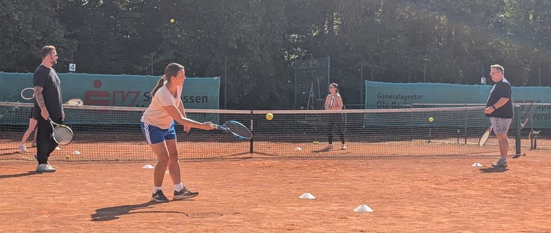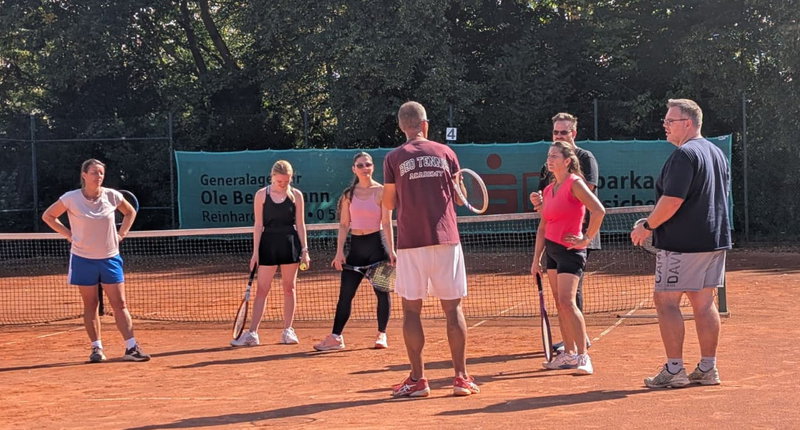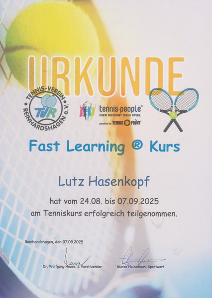 Mit 7 Teilnehmern startete Tennistrainer Gigi Borovac am 11. Mau 25 den 20. Fast Learning Kurs für Erwachsene. Am ersten Kurstag standen einige Grundlagen und erste Übungen mit Schläger und Ball auf dem Programm - in der Gruppe, spielerisch und mit jeder Menge Spaß.Zum 3. Tag am 01.06.25 um 11:00 fanden die letzten Trainerstunden statt. Danach lud der Verein zu einem Abschlussmeeting mit kalten Getränken und Bratwürsten vom Grill ein. Dabei wurden Teilnehmerurkunen und eine Begrüßungsmappe vom 1. Vorsitzenden in Anwesenheit des Sportwarts Marco Heinemann und des Kassenwarts Michael Weddig überreicht.