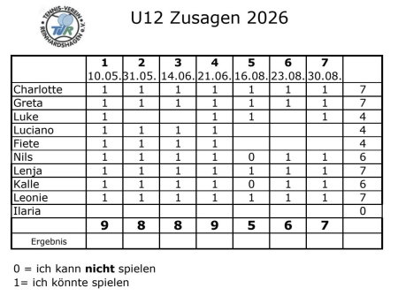 Alle Spielerinnen und Spler der Mannschaft und deren Eltern sind eingeladen am Sonntag, 26. April um 14:00 Uhr auf die Tennisanlage des TV Reinhardshagen. Wir wollen uns Kennenlernen, ein paar Matches spielen, den Terminplan besprechen und abschließend gemeinsam etwas vom Grill essen.