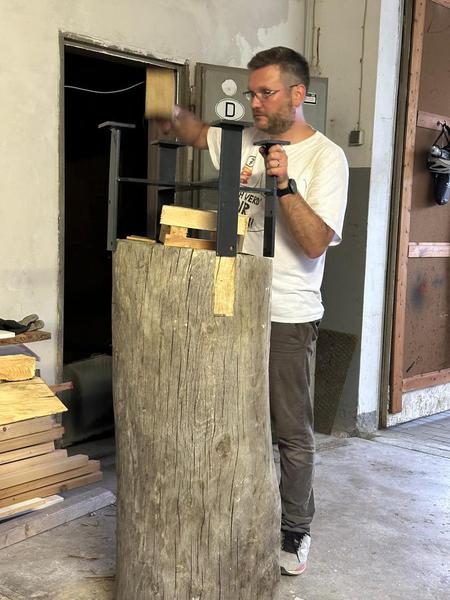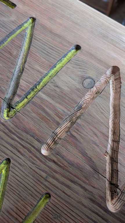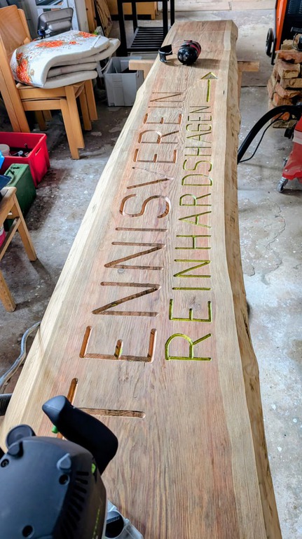 Oskar Reich und Jan Ciupa ergriffen die Initiative und organisierten geeignets Holz für einen Neuaufbau. Ende August wurde mit Hilfe Fa. Wenzel und Elektro Jatho das Holz angeliefert und geschnitten. In den nächsten Wochen haben Jan und Oskar das Holz geschält und die Tafel mit unserem Namen geschliffen. Die Untergestelle einer neuen Konstruktion sind gefertigt und in den nächsten Wochen wird das Projekt fertiggestellt.