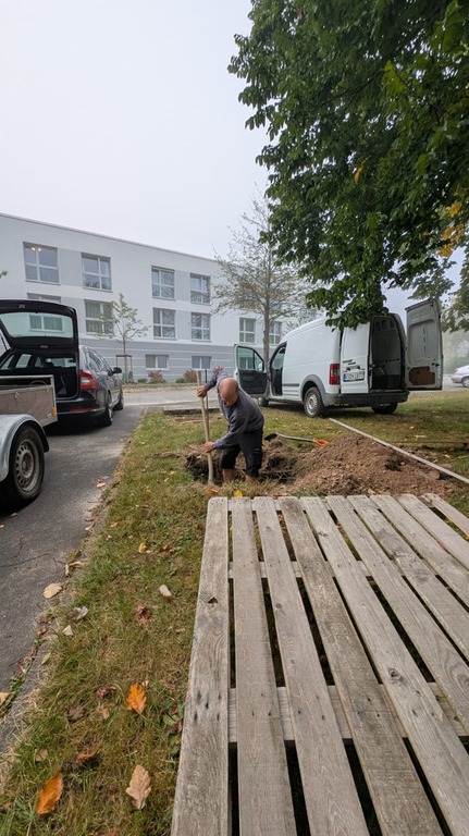 02.11.24: Die Aktion zur Sanierung des Eingangsschildes geht weiter voran. In den letzten Tagen wurde das alte Fundament ausgehoben und Jan mit Oli, Michael, Marco und Maxim haben versucht, den alten Stützpfeiler aus dem Fundament zu holen.