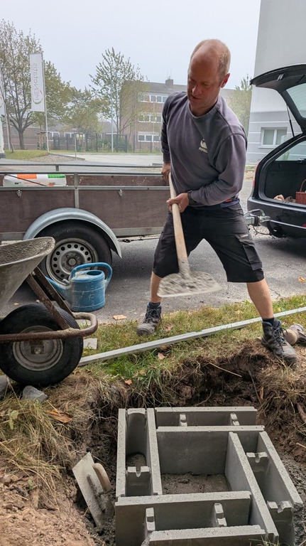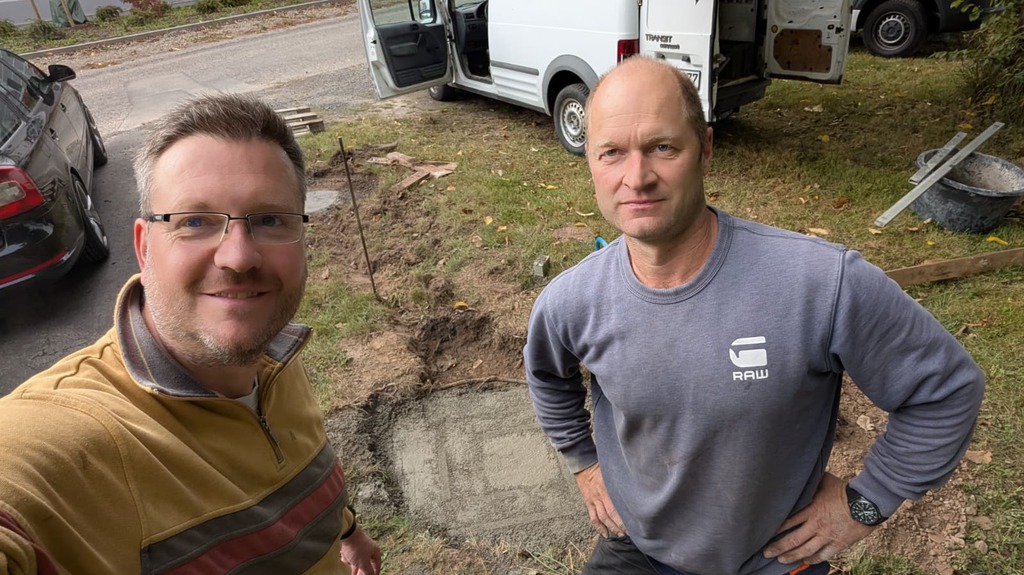06.09.25: Die Fundamente für die zwei Pfeiler wurden gegossen, ein weiterer Schritt wurde mit Hilfe von Marc Schlicker geschafft. Außedem hat Jan Ciupa die Oberfläche des Schildes bearbeitet.