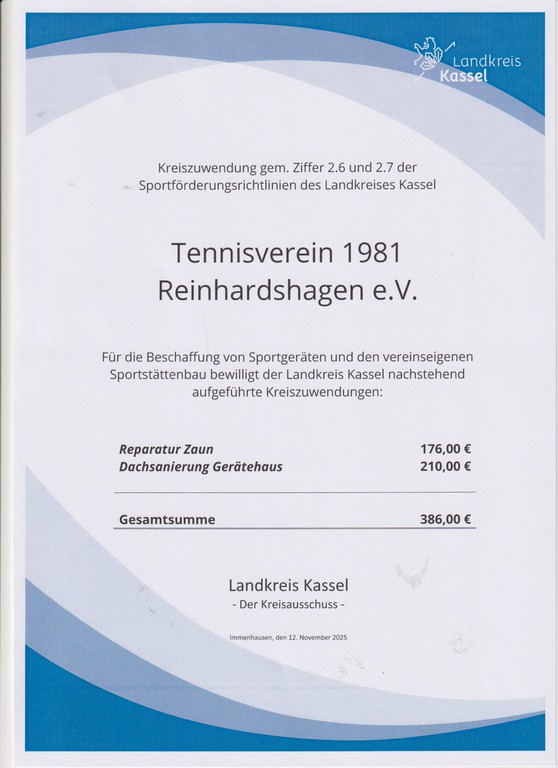 Am 12.11.25 hatte der Landrat Siebert u.a. den Vorsitzenden des Tennisvereins zur Übergabe der Bescheide für Fördermittel nach Immenhausen eingeladen. Für unsere Projekte „Reparatur Zaun“ und „Dachsanierung Gerätehaus“ erhielten wir 386,00 Euro.